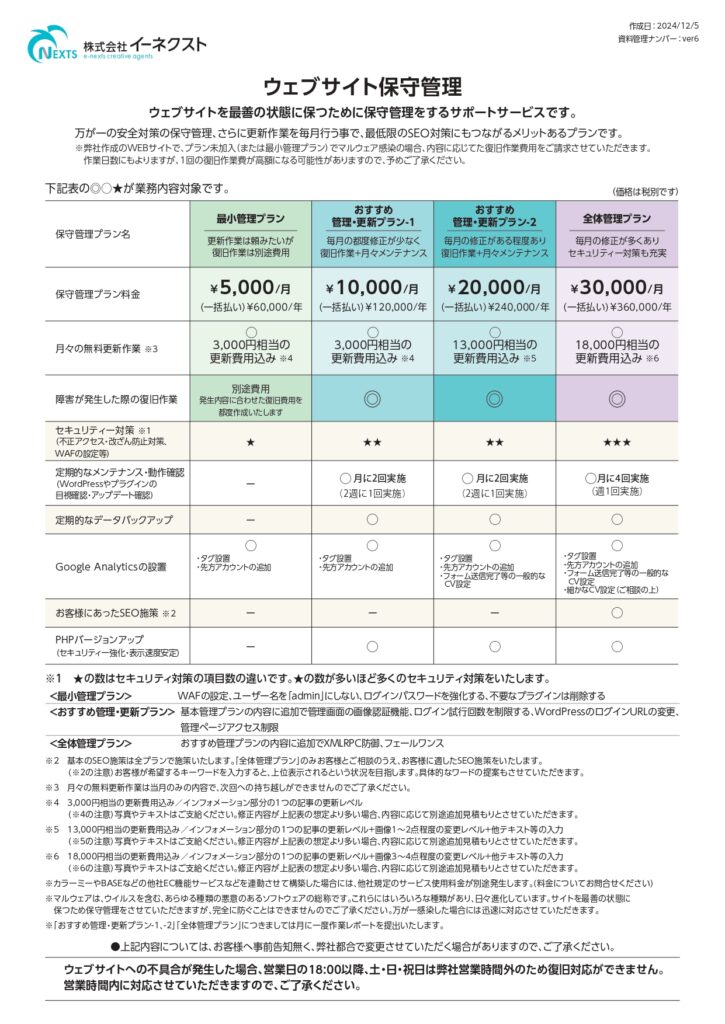 | 全体管理プラン | 毎月の修正が多くあり、セキュリティー対策も充実 | ¥30,000/月 | ¥360,000/年 |