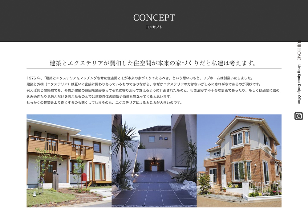 フジホーム様の元々のWEB デザインが綺麗でした。施工例画像も自社で撮影されていて美しいので、画像を生かしたデザインにで再度まとめる事とさせていただきました。