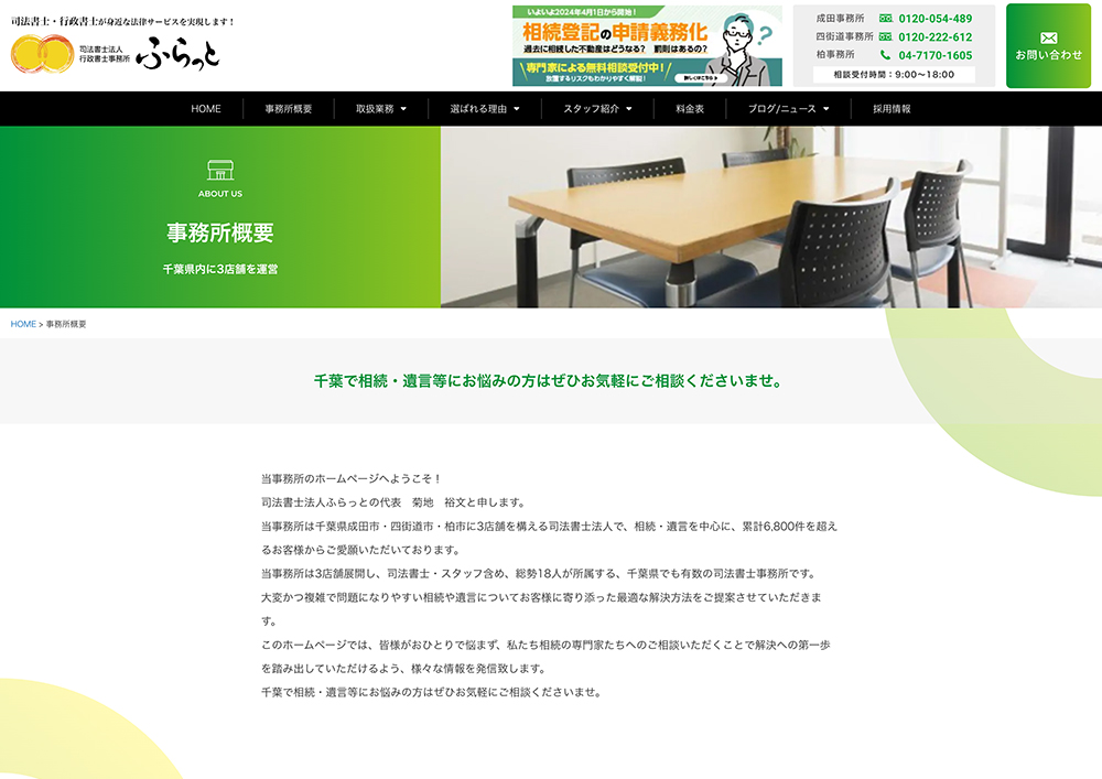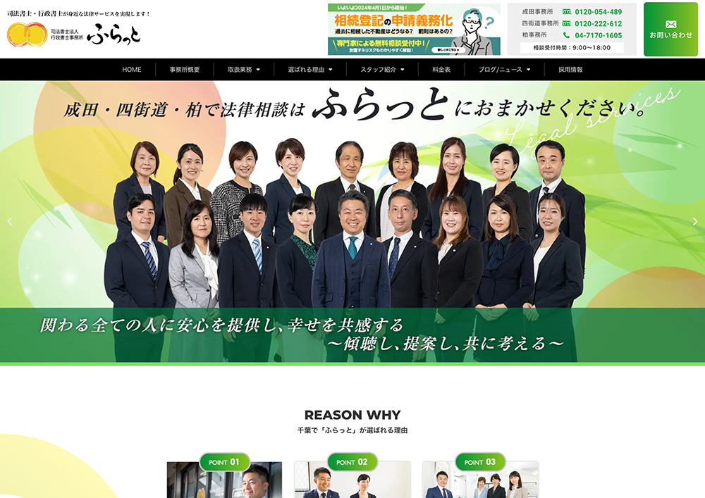 司法書士法人・行政書士事務所ふらっと様のウェブサイト(ホームページ)を制作させていただきました。